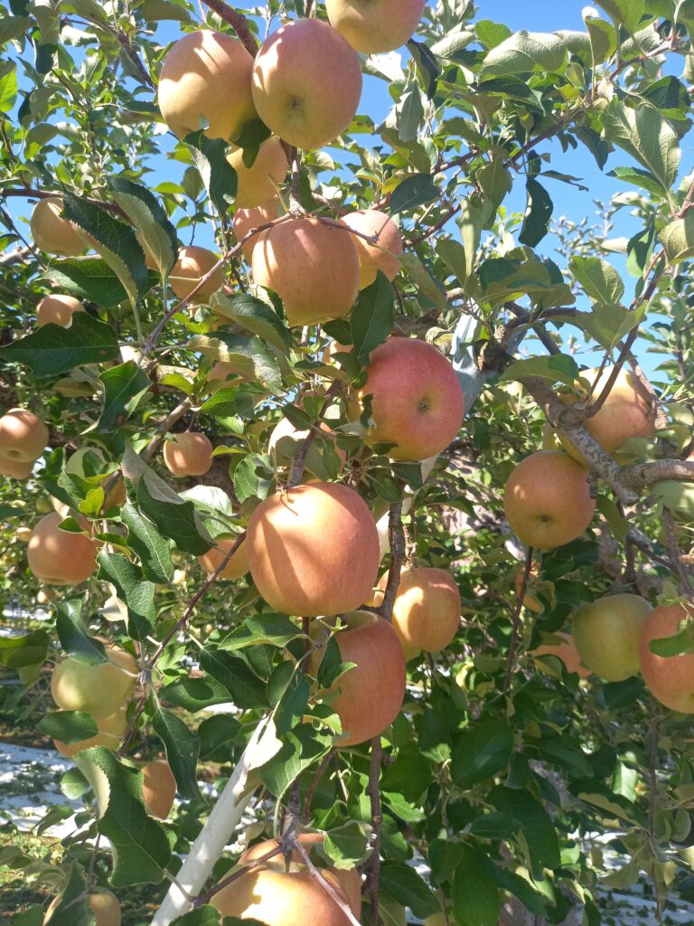 ふじリンゴの着色時期になりました。果実に密着している葉を取り除く