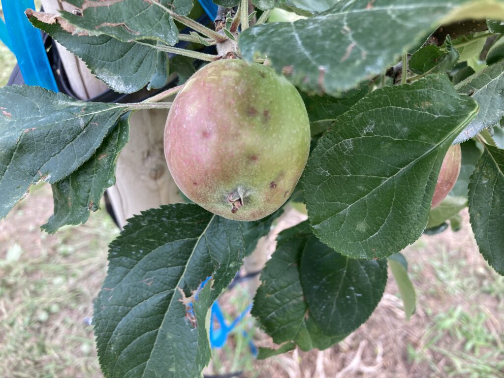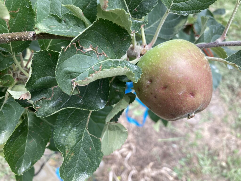 6月3日突然、雹(ひょう)が成長途中のりんごの幼果実に降り注ぎ、表面がデコボコに傷